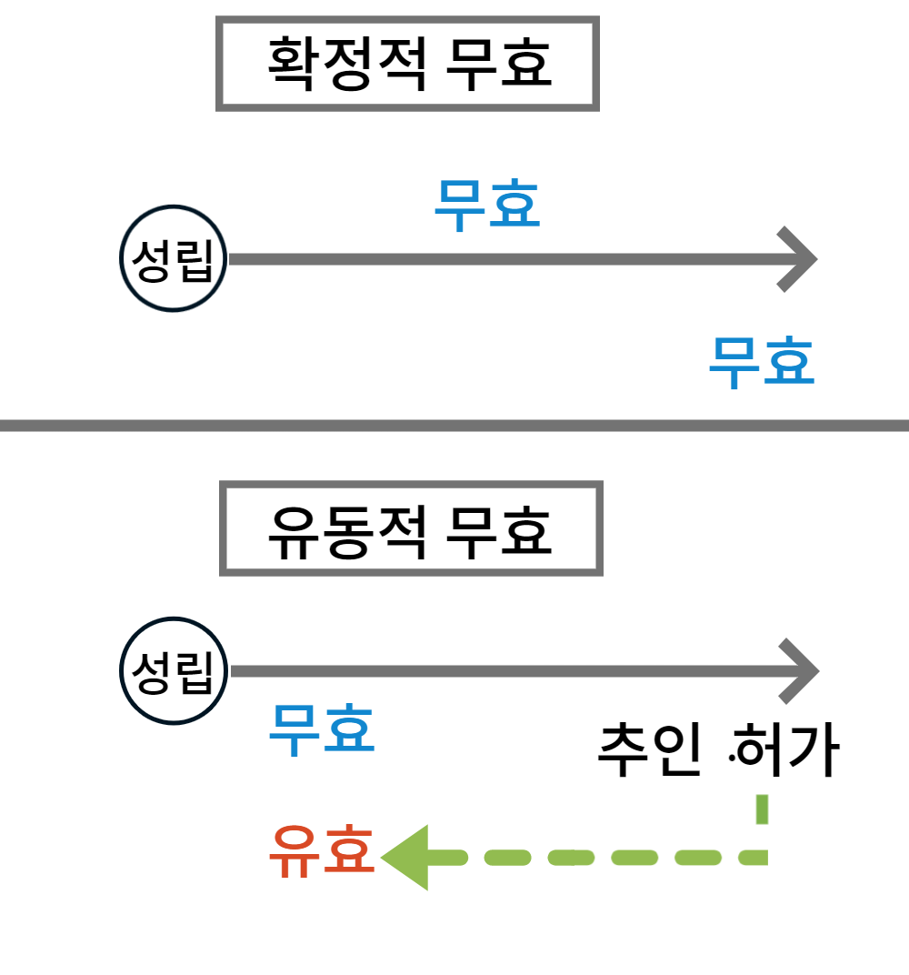 - 무효원인이 소멸되지 않는 반사회적 법률행위나 불공정한 법률행위, 강행법규 위반의 법률 행위는 추인에 의해 유호로 될 수 없다.